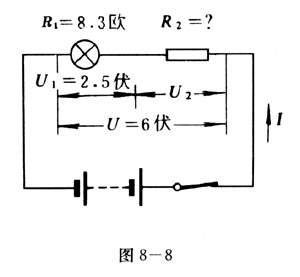 先画出电路图(图8-8).根据串联电路中电压的关系U=U1+U2可以看出,给小灯泡串联一个电阻R2,可分去一部分电压,使小灯泡两端的电压U1为正常的工作电压2.5伏.所以R2分去的电压U2应该等于U一R2的阻值应该是多大,才能分能分去电压U2呢?根据欧姆定律,如果知道通过R2n的电流I,就可以求出R2=U2/I。